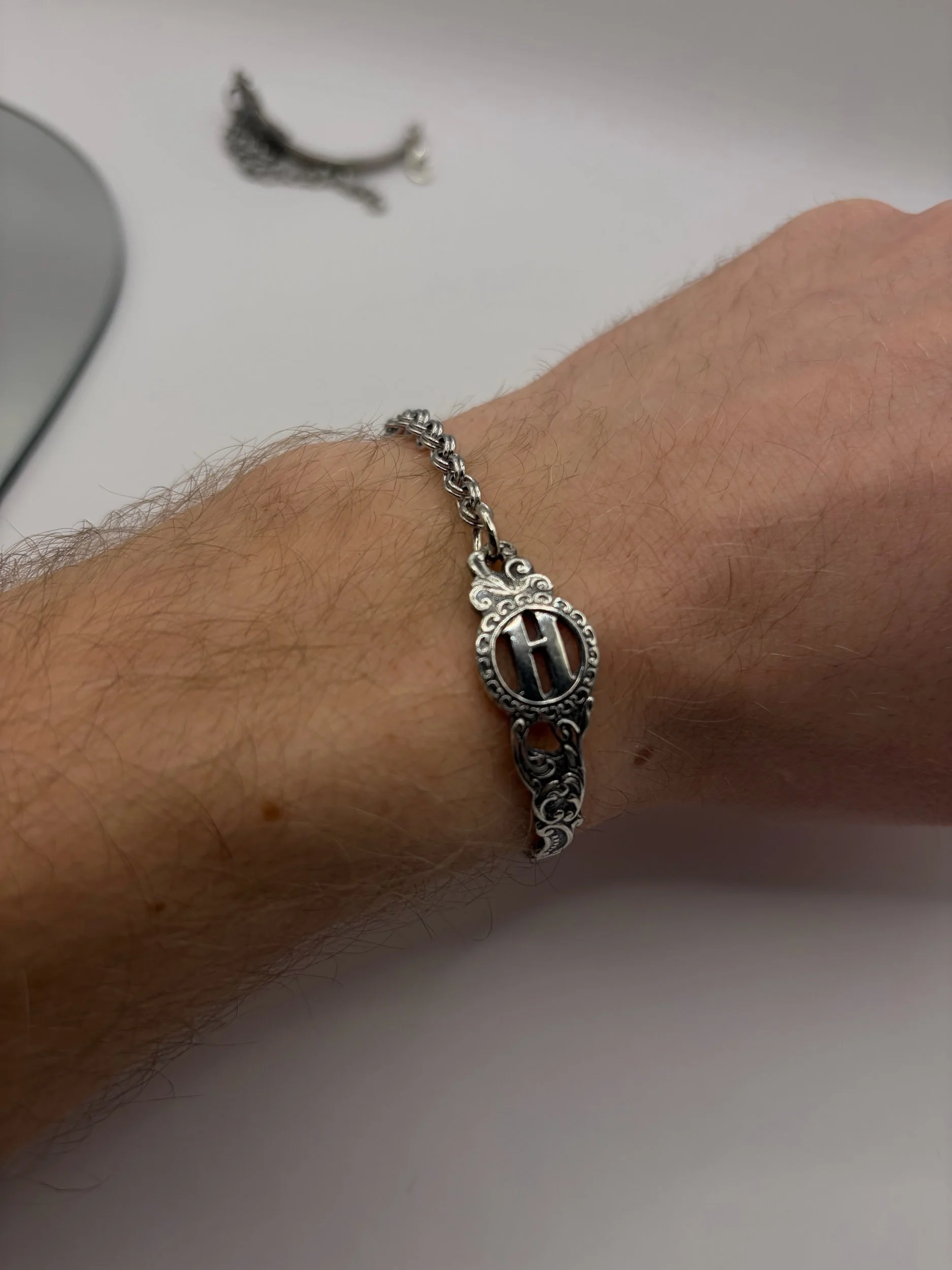 Handgemaakte armband van een verzilverd lepeltje met de letter H. Het lepeltje is met de hand gebogen tot een armband, waardoor elk stuk een eigen vorm en karakter heeft.